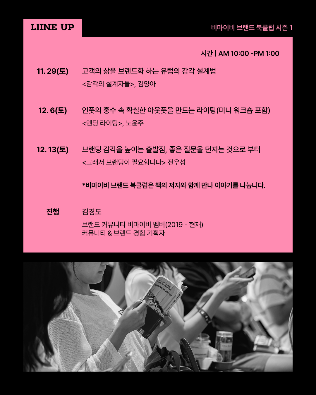 오랜만에 시즌제 커뮤니티 모임을 진행하게 되었는데요. 이번 브랜드 북클럽 시즌 1은 2019년부터 비마이비의 대학생 멤버로 처음 참여를 시작해, 현재까지 꾸준히 활동을 이어오고 있는 커뮤니티 & 브랜드 경험 기획자 경도 (@longitude_kim) 님이 함께 기획해 진행합니다.