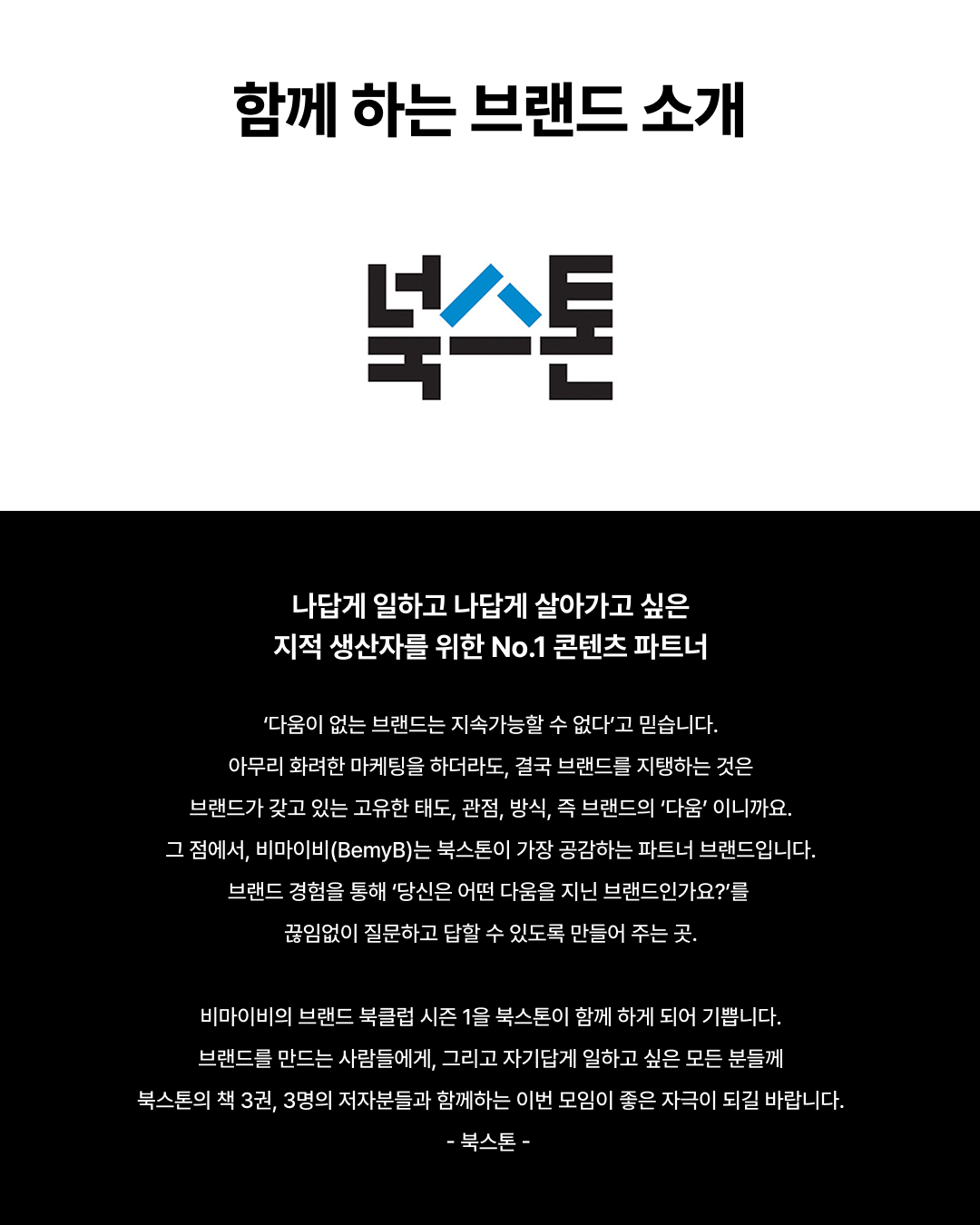 브랜드 북클럽 시즌 1은 브랜드 마케팅 업계를 넘어 일을 잘 하고 싶은 사람이라면 누구에게나 잘 알려진 출판사 북스톤, 김양아 저자, 노윤주 저자, 전우성 저자님, 그리고 15명의 브랜드에 진심인 북클럽 멤버분들과 함께합니다!